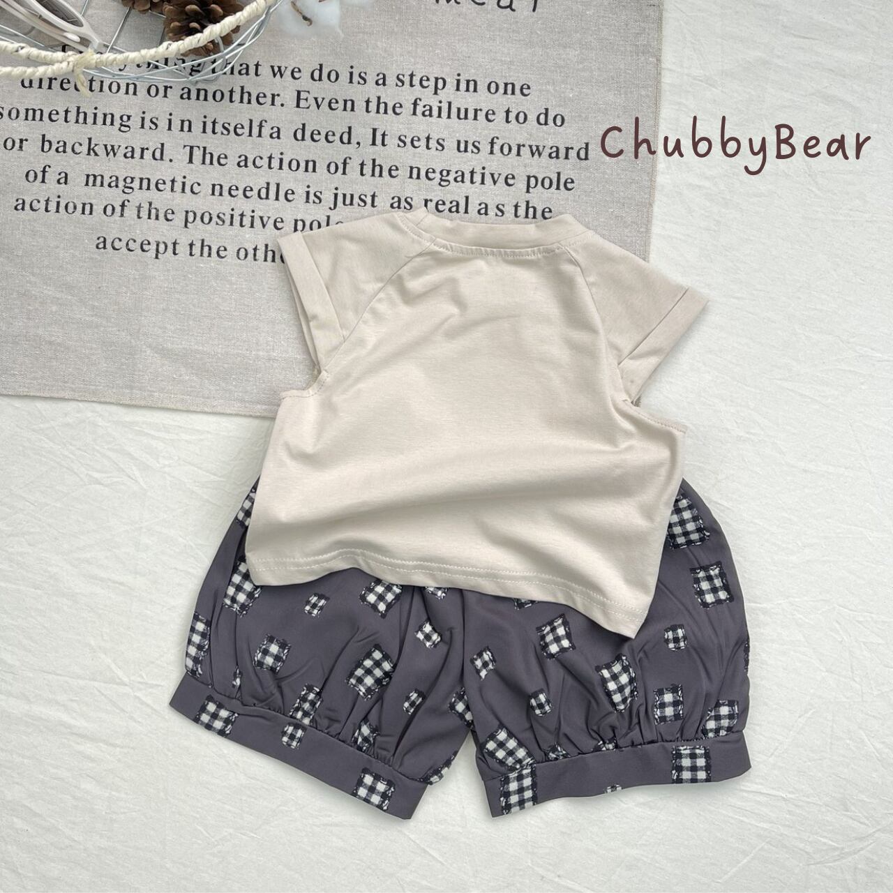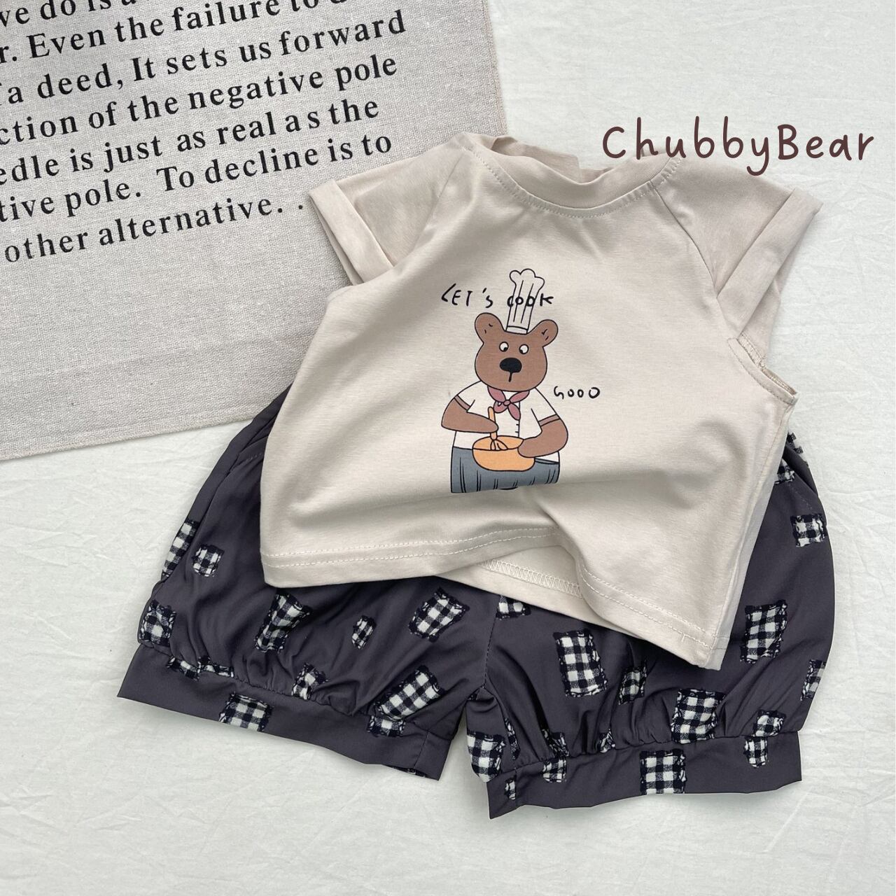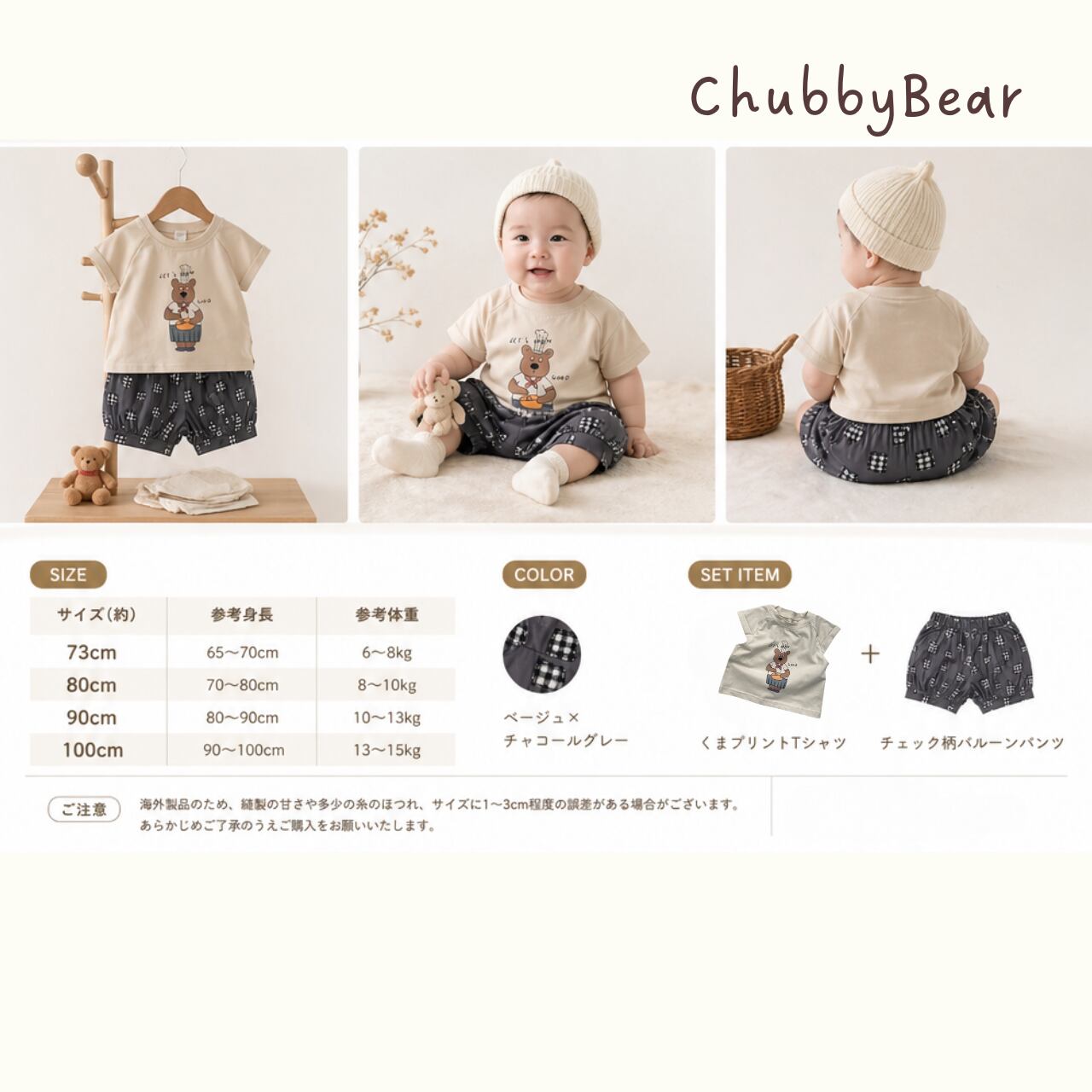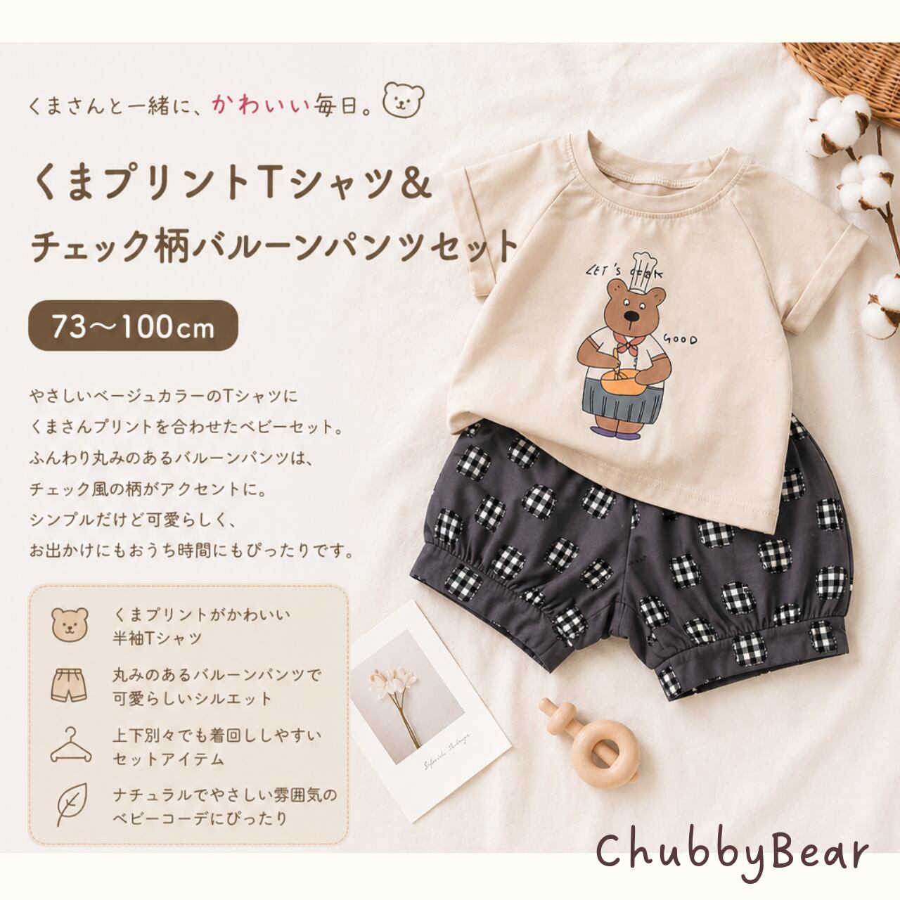 【73〜100cm】やさしいシェフくまTシャツ&チェック柄バルーンパンツセット